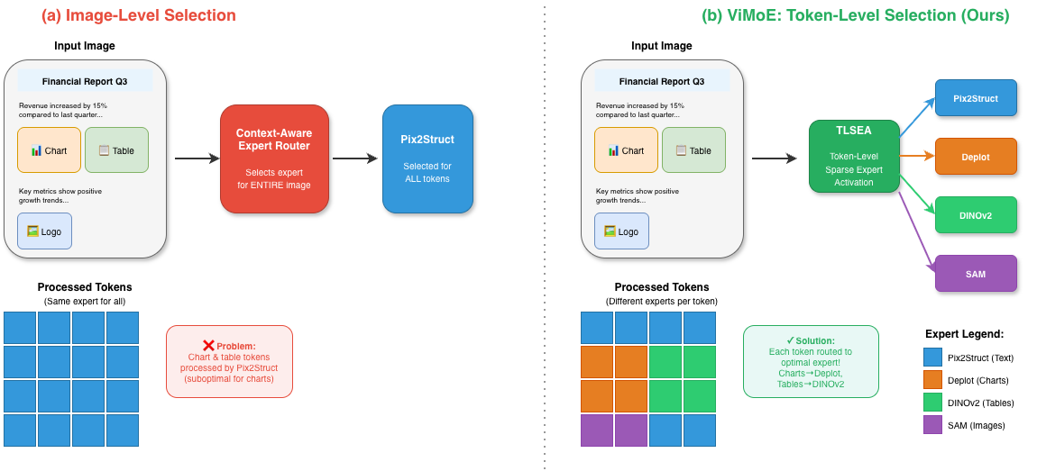 In reality, documents contain both text paragraphs and embedded charts. Natural images have both foreground objects and background scenes. Medical images combine anatomical structures with text annotations. ViMoE recognizes this spatial heterogeneity within images and routes different regions to different experts. Text regions route to document experts (Pix2Struct, Vary), chart regions route to visualization experts (Deplot), and scene regions route to general-purpose encoders (DINOv2). This fine-grained routing enables precise knowledge extraction without "averaging out" expert strengths and weaknesses.